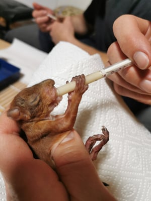 5 Eichhörnchen-Waisen werden liebevoll von den Betreibern des Tierhilfswerk-Burgenland von Hand aufgezogen.